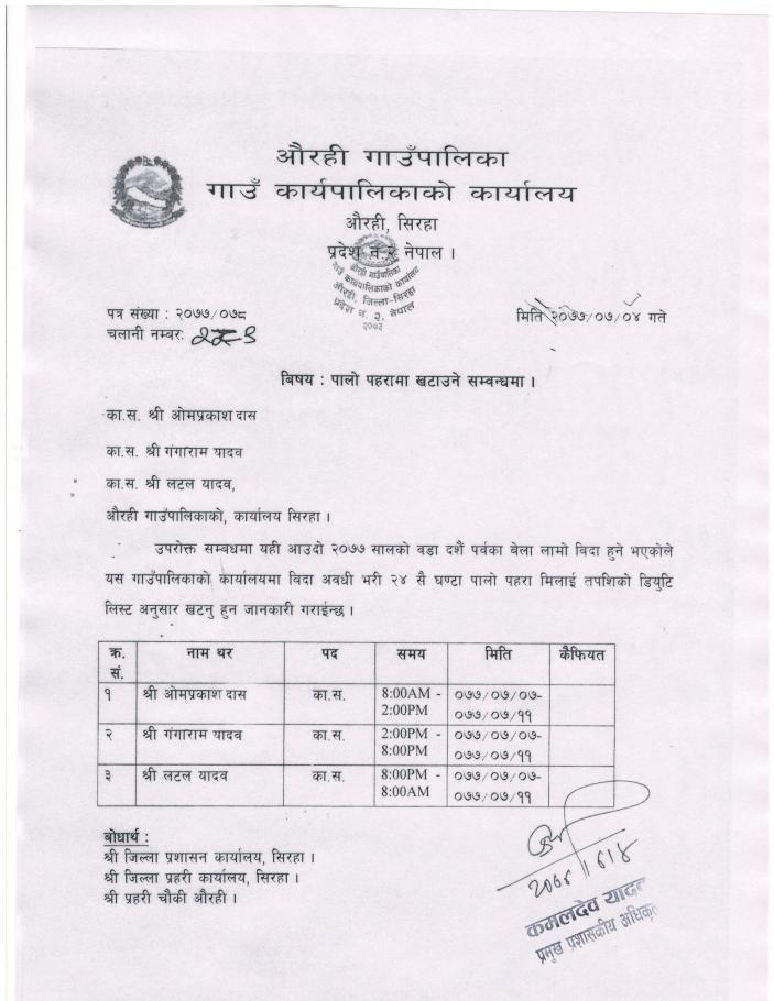 दशाैँ विदाकाे समयमा पालाे पहरामा खटाइएकाे कर्मचारीहरूकाे डियुटी लिस्ट