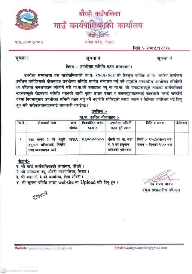 उपभोक्ता समिति गठन सम्बन्धमा |