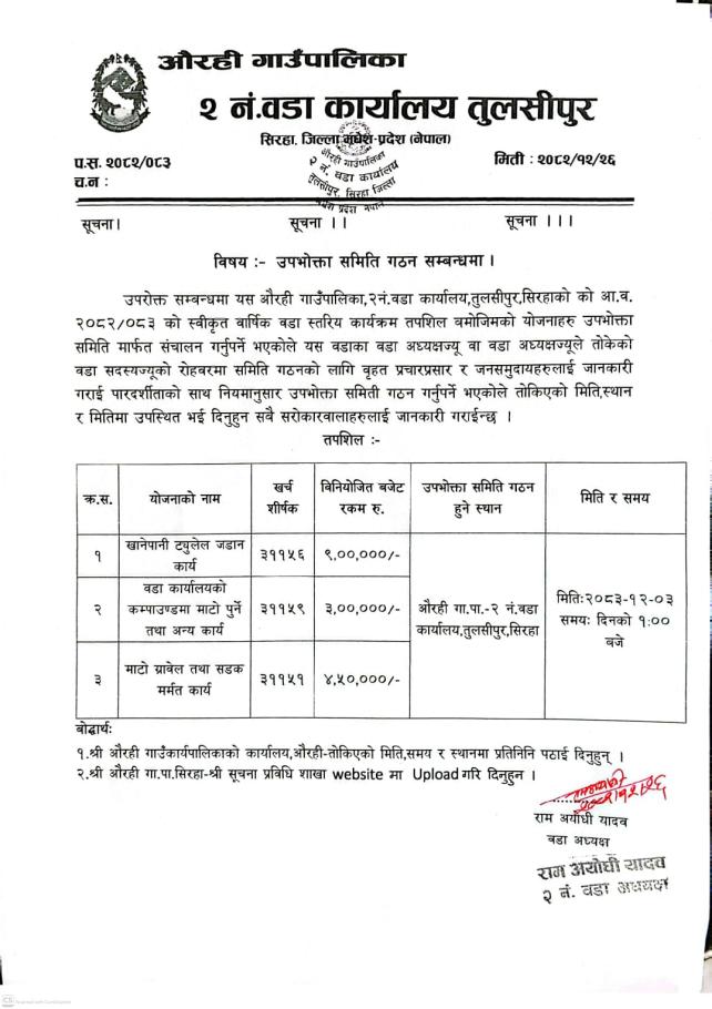 उपभोक्ता समिति गठन सम्बन्धी सूचना ।